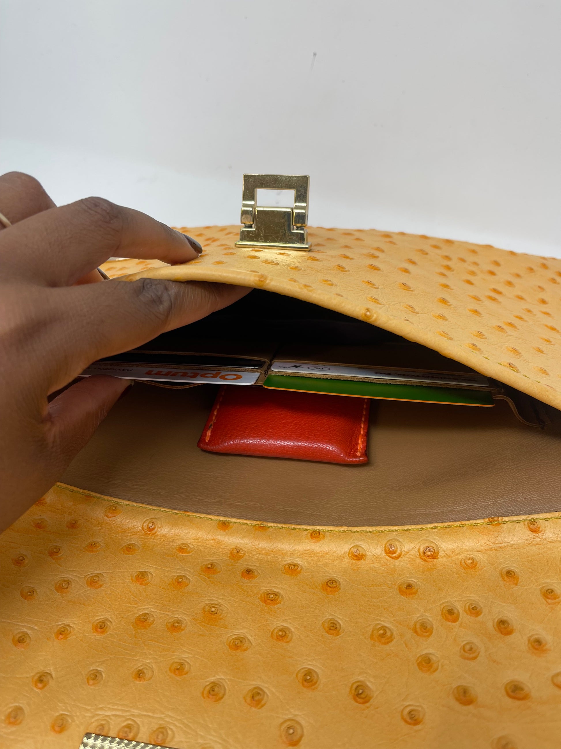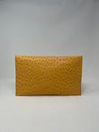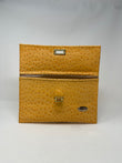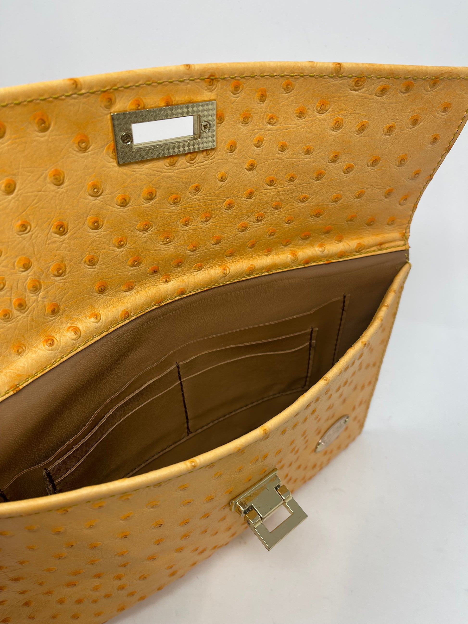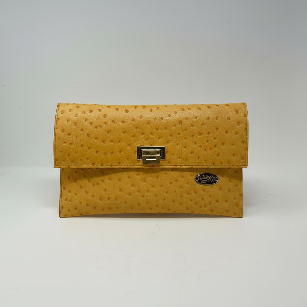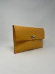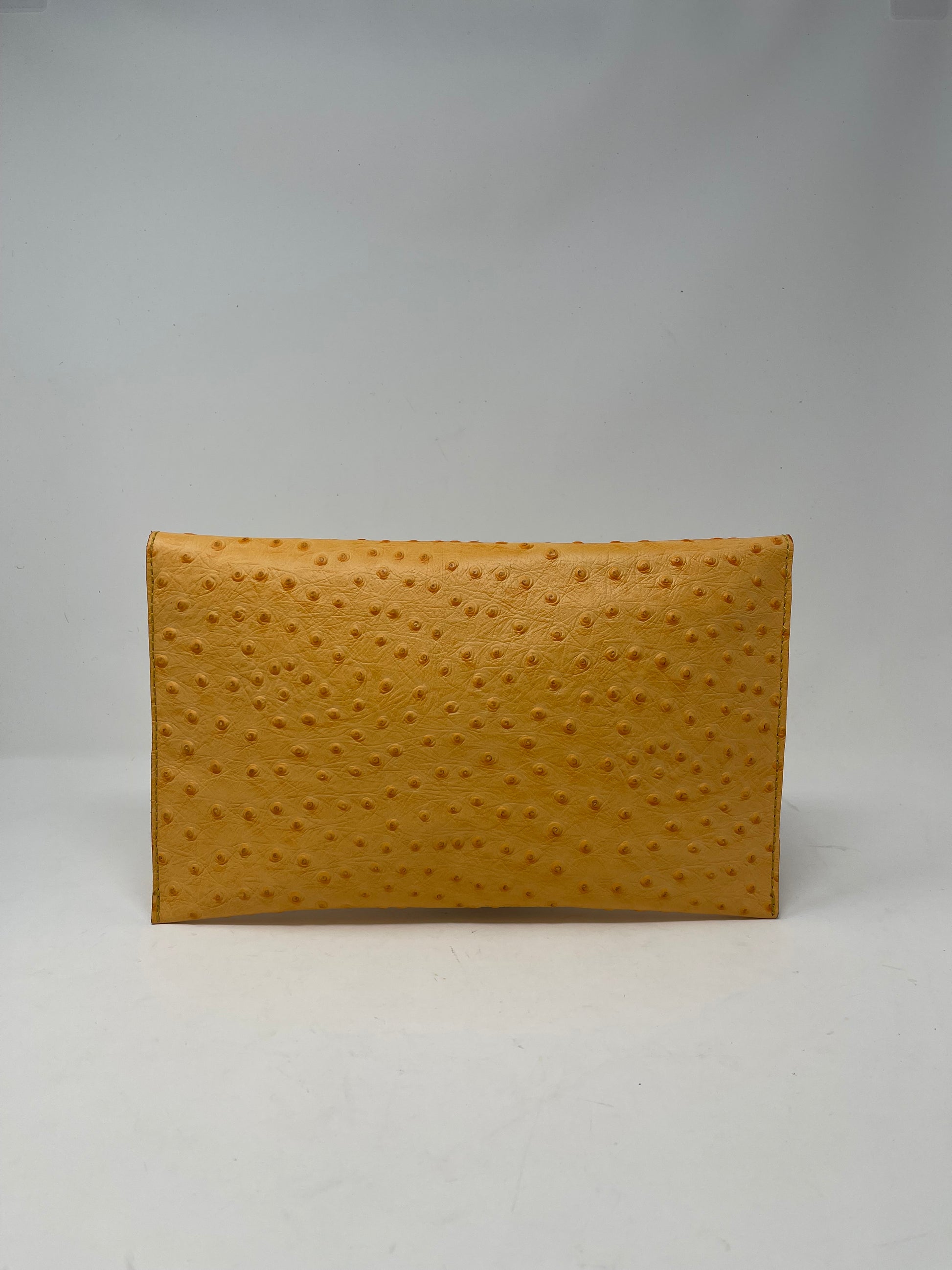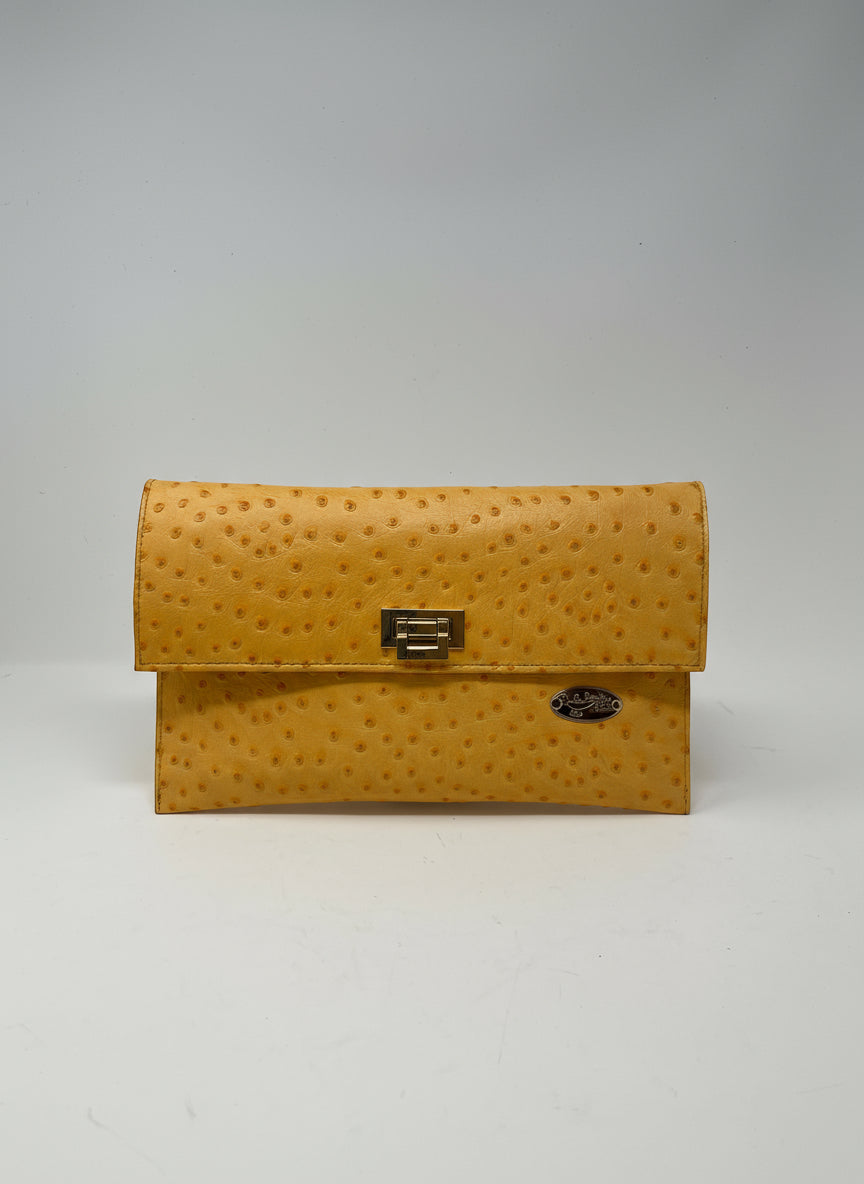 This textured one of clutch is made from a yellow embossed ostrich leather. It’s compact yet spacious, providing inside pockets for all of your most important needs. It features gold hardware in the form of a tag as well as a barrel turn closure.
