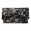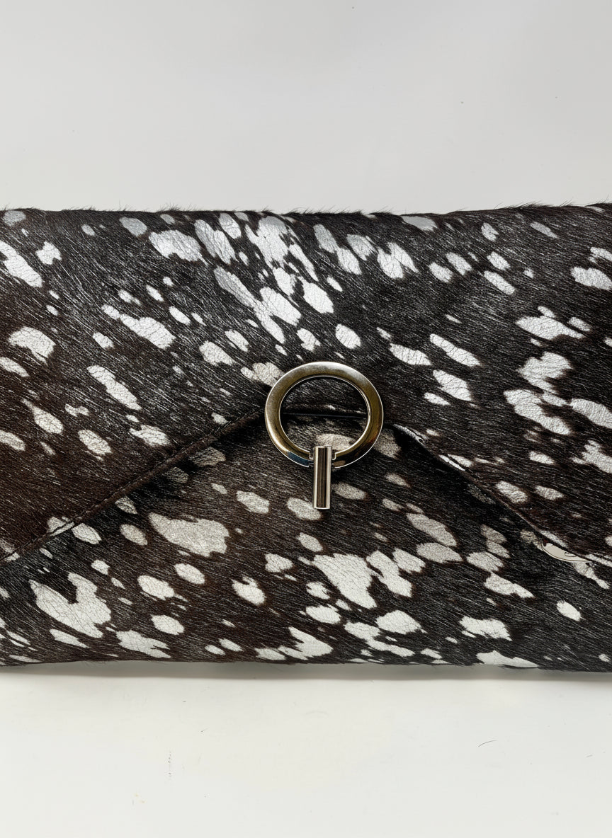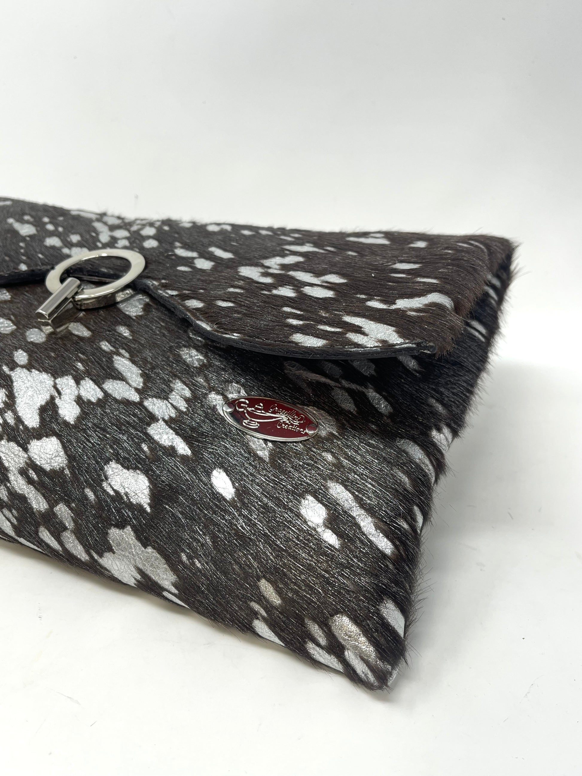 This Grassillini One-of-a-Kind Clutch is crafted from a genuine leather hair-on cowhide. Its dark brown and black tones are accented with flashes of metallic silver, giving it a striking, modern edge.